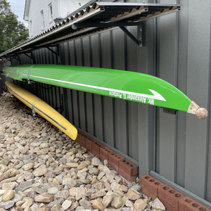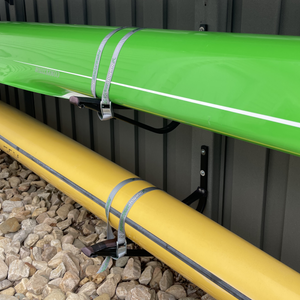 Part of the challenge of owning a rowing shell is storing it. For most, space is at a premium indoors or outdoors. These simple, sturdy Sculling Boat Hangers are adapted from our Sculling Boat Hoists and can be mounted on a wall or a post (such as on a deck or a fence). They make storing your boat in tight spaces simple. The wall mounted configuration will accept only de-rigged boats. The post mounted configuration will accept rigged or de-rigged boats. Padded polyester webbing provides maximum protection for your decks. Bungee cords temporarily secure your shell in the Boat Hangers and footman loops allow you to secure your boat with straps permanently so that nothing can send your boat for an unexpected tumble. Powder coated black for protection from the elements.  Fits single and double sculls.  Includes one pair of hangers, enough to hang one single scull or one double scull.